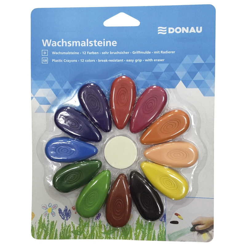 Unikatne voščenke DONAU v obliki kapljice so posebej zasnovane za najmlajše ustvarjalce. Ergonomska oblika omogoča lahek oprijem in udobno risanje, tudi za male otroške roke. Izdelane so iz trpežnega materiala, ki ne pušča madežev, in se ne lomijo pri padcu.